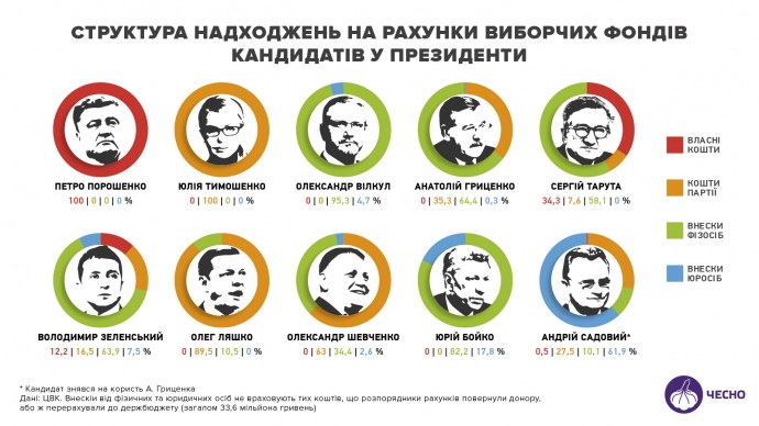 Среди кандидатов, которые вложили в избирательную кампанию значительную часть своих сбережений, также Сергей Тарута и Владимир Зеленский. Каждый из них перечислил в свой избирательный фонд 33 и 11,5 миллиона соответственно.