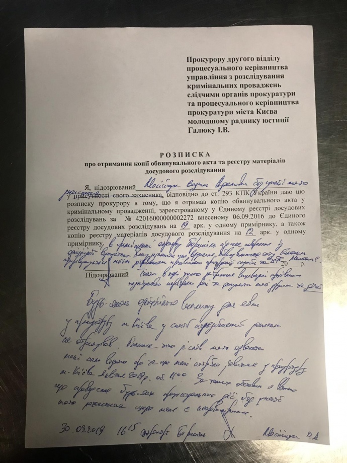 По его словам, акт вручен без официального вызова в прокуратуру, что нарушает действующие нормы, хотя предварительно его адвокат согласовал с прокуратурой г. Киева, что Мосийчук появится в прокуратуру в понедельник, 1 апреля.