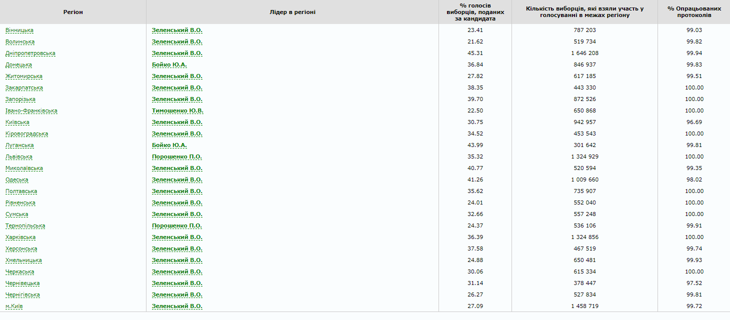 Согласно информации на сайте ЦИК, осталось обработать небольшое количество протоколов из Винницкой, Волынской, Днепропетровской, Донецкой, Житомирской, Киевской, Луганской, Николаевской, Одесской, Тернопольской, Херсонской, Хмельницкой, Черновицкой, Черниговской областей и из территориального избирательного округа №217 Киева (Оболонский район).