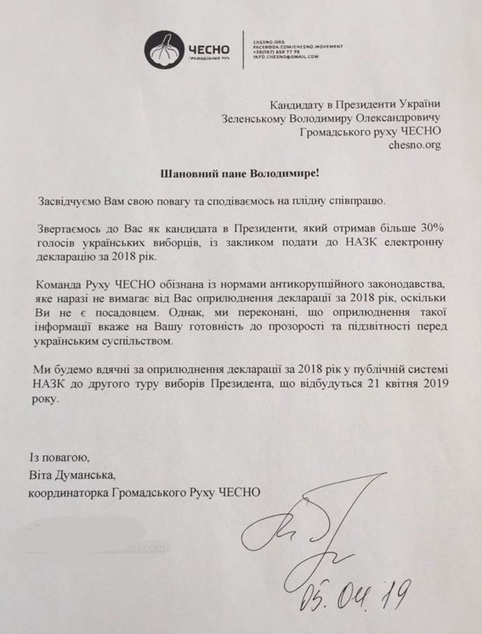 Движение "Честно" призывает кандидата в президенты Владимира Зеленского обнародовать декларацию за прошлый год.