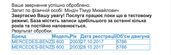 Согласно выписке из Единого государственного реестра МВД Украины, авто Mercedes-benz S 600 2003 года выпуска, правда, без указания номеров, действительно зарегистрировано на человека с именем Миндич Тимур Михайлович.