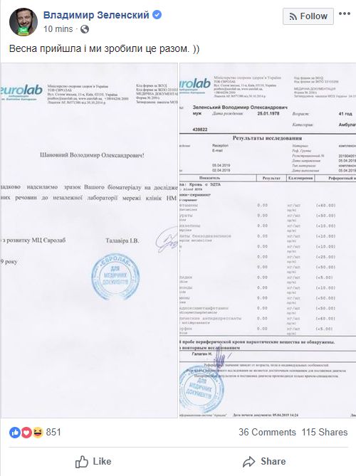 - Утром 5 апреля Зеленский сдал кровь в "Евролабе", Основателем и владельцем лаборатории "Евролаб" является Андрей Пальчевский, который в 2010 году несколько месяцев работал первым заместителем министра по делам семьи, молодежи и спорта, а теперь выражает поддержку Зеленскому.