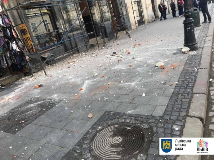 С архитектурного здания на площади Рынок, что в центре Львова, на тротуар осыпался кирпич, никто из прохожих не пострадал.