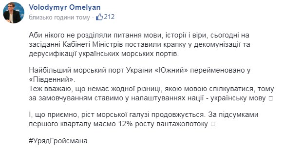 "Чтобы никого не разделяли вопросы языка, истории и веры, завтра вносим на заседание правительственного комитета Кабинета Министров окончательное решение вопроса декоммунизации и дерусификации украинских морских портов. Крупнейший морской порт Украины "Южный" будет переименован в "Пивденний ", - написал он.