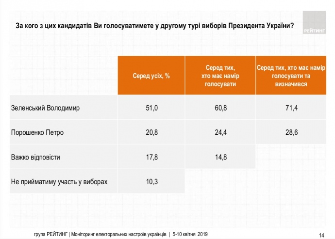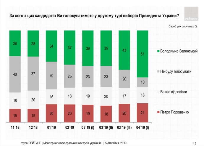 Отмечается, что среди всех опрошенных, отвечая на вопрос: "За кого из этих кандидатов вы будете голосовать во втором туре выборов президента?", 51% респондентов ответили, что проголосовали бы за Зеленского, а 21% - за Порошенко, 18% не определились и 10% сказали , что не будут принимать участие в голосовании.