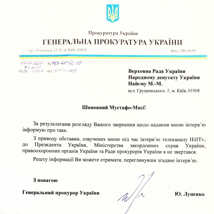 Об этом в своем телеграмме написал нардеп Мустафа Найем, обнародовав ответ Луценко на его запрос.