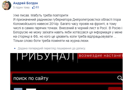 "Внесен в черный лист в России. В Россию и Белоруссию не могу заехать даже если бы хотел))) вся эта информация у меня на странице в ФБ, но кого это интересует когда надо отрабатывать... Только слово боты надо поменять на журна.люхы", - написал он.