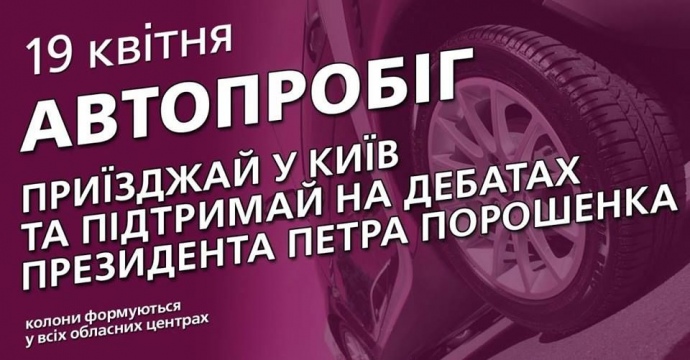 Предвыборный штаб Петра Порошенко предлагает устроить 19 апреля автопробег, приуроченный к дебатам с кандидатом Владимиром Зеленским.