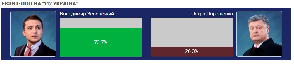 Экзит-пол канала "112 Украина" (подконтрольный Виктору Медведчуку) показал следующий результат: Зеленский – 73,7%, Порошенко – 26,3% голосов избирателей.