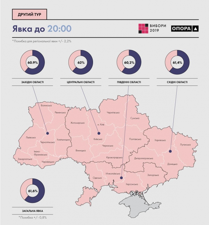 Явка по регионам Украины с погрешностью 2,2% составила: в центре Украины - 62%, на востоке - 61,4%, на юге - 60,2%, на западе - 60,9%.