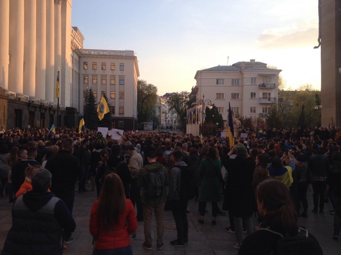 У Администрации президента собрались сторонники президента Петра Порошенко, который впоследствии вышел к ним и поблагодарил за поддержку.
