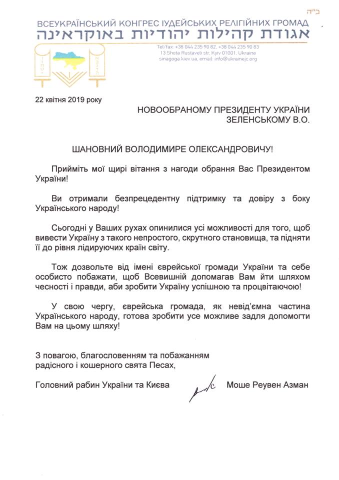Главный раввин Украины и Киева Моше Реувен Азман поздравил Владимира Зеленского с победой на выборах президента.