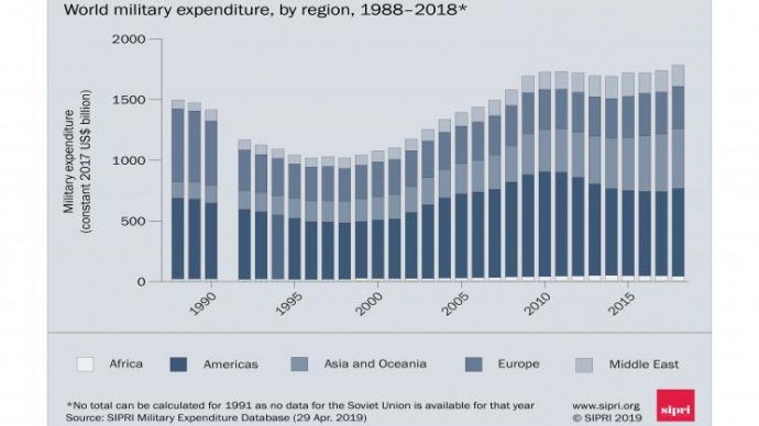В 2018 году мировые военные расходы выросли до $1822 млдр, что на 2,6% больше, чем в 2017 году и является самым высоким показателем с 1988 года.