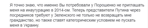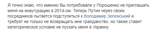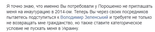 "Теперь Вы через третьих лиц пытаетесь подступиться к Владимиру Зеленскому и требуете не только не возвращать мне гражданство, но также ставите категорическое условие не пускать меня в Украину", - заявил политик.