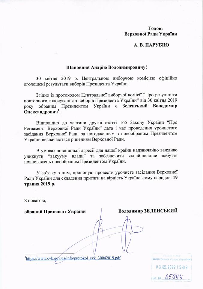 Победитель второго тура выборов президента Украины Владимир Зеленский написал письмо на имя председателя Верховной Рады Андрей Парубий назначения даты инаугурации.