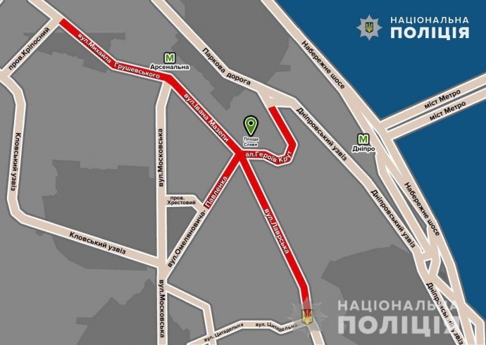 Как ранее сообщала КГГА, с 5 утра перекрыто движение на улицах Грушевского (от переулка Крепостного до улицы Арсенальной), Московской (от Кловского спуска до площади Арсенальной), Мазепы (от площади Арсенальной до улицы Лаврской), Н. Омеляновича-Павленко, Лаврской (от улицы Мазепы до улицы Цитадельной).