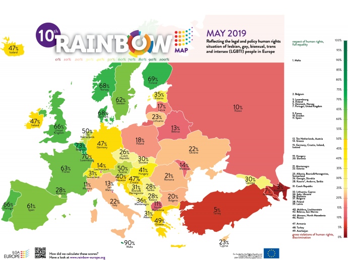 В рейтинге ILGA-Europe, который ежегодно публикует достижения европейских стран в сфере обеспечения равенства ЛГБТ-сообществ, Украина оказалась на 35 из 49 мест.