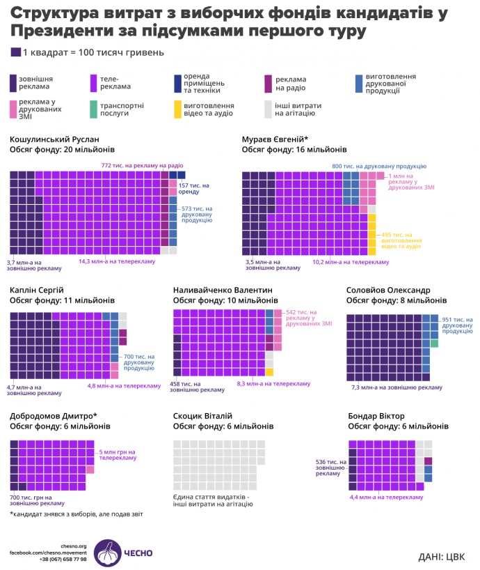 Кандидаты потратили 1,7 млрд в первом туре, треть из этого Порошенко – ЧЕСНО