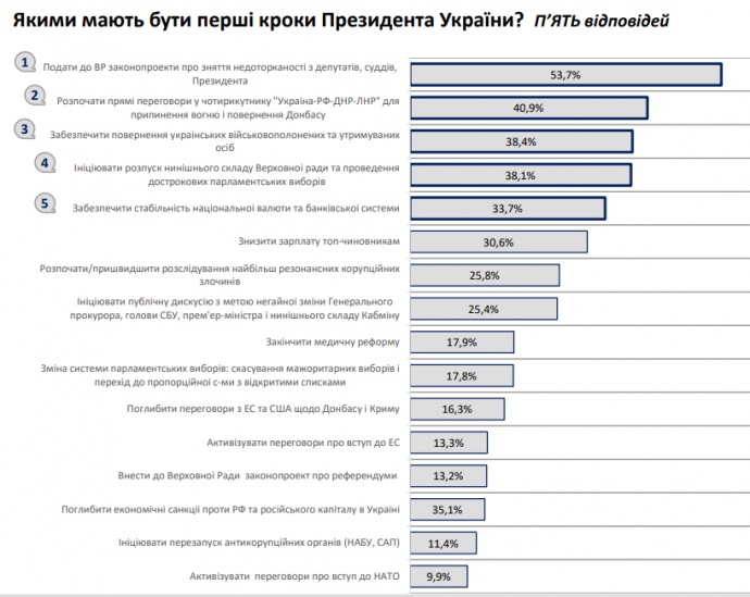 "Одним из ключевых ожиданий и разочарований революции достоинства было изменение системы власти, поэтому вполне логичным выглядит, что лидером среди первых ожидаемых шагов от президента Украины стало снятие неприкосновенности с депутатов, судей, президента, на что указали 53,7% опрошенных", - сказано в сообщении.