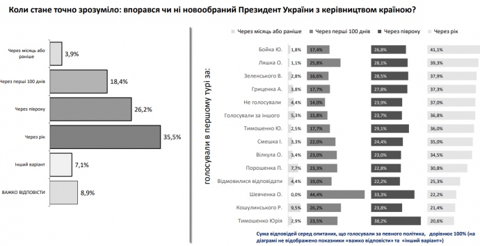 "Итак, новоизбранному президенту Украины избиратели дают не больше года, чтобы понять – справился ли он с руководством страны. Данные показывают, что более 80% максимум через год будут определять свое отношение к президенту Украины, основываясь на действиях и результатах соответствии со своими ожиданиями", - заявляют социологи.