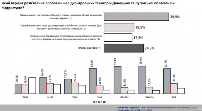 39,9% украинцев считают, что для решения проблемы неподконтрольных территорий Донбасса нужно предоставить этим территориям статус автономии в составе Украины.