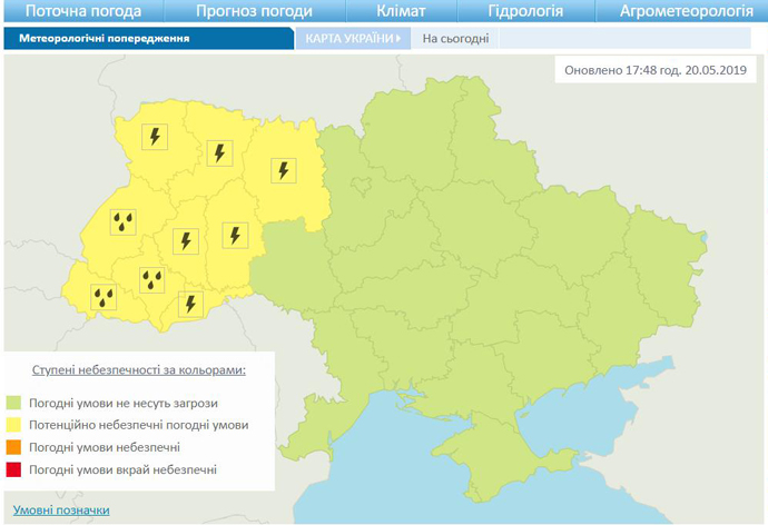 Кроме того, по данным Укргидрометцентра, 21 мая в западных, северных и центральных областях местами грозы, в западных областях при грозах шквалы 15-20 м/с, на Закарпатье и Прикарпатье значительные, в Карпатах местами сильные дожди.