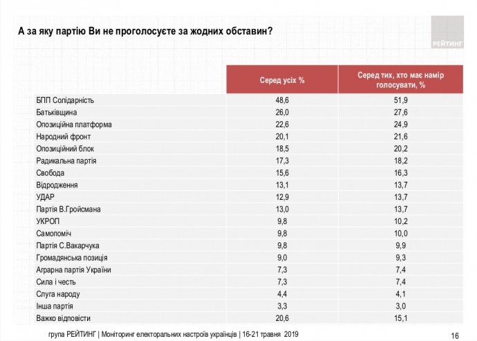 Исходя прежде всего из симпатий к лидеру голосуют 14%, идеологических основ - 10%. Также в результатах опроса указывается, что более 70% респондентов поддерживают идею роспуска парламента и проведения досрочных выборов Верховной Рады.
