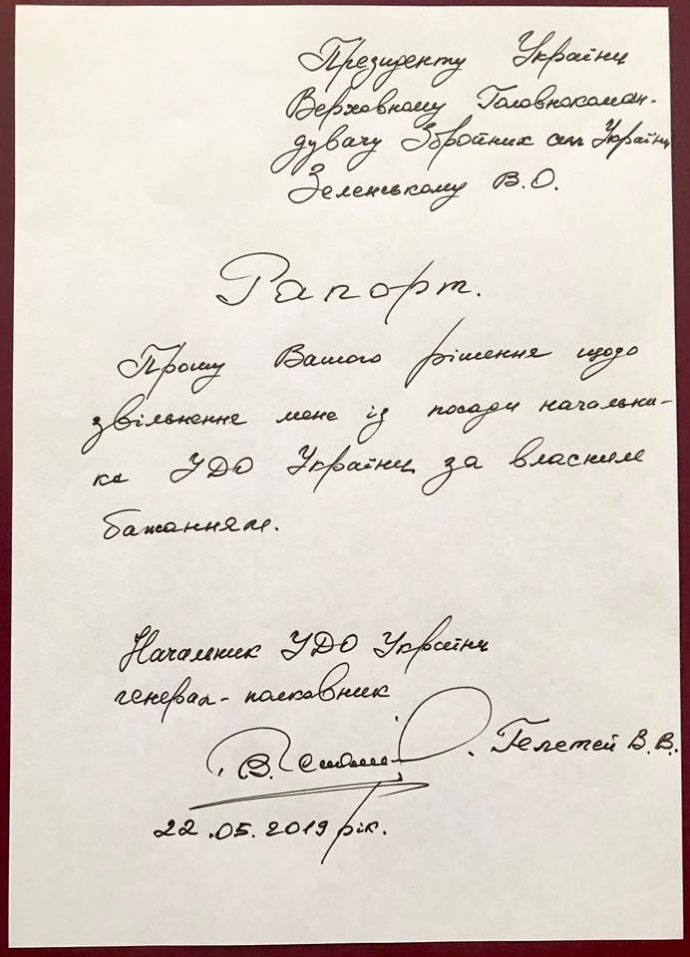 Начальник Управления Государственной охраны Валерий Гелетей заявил, что написал рапорт на увольнение.