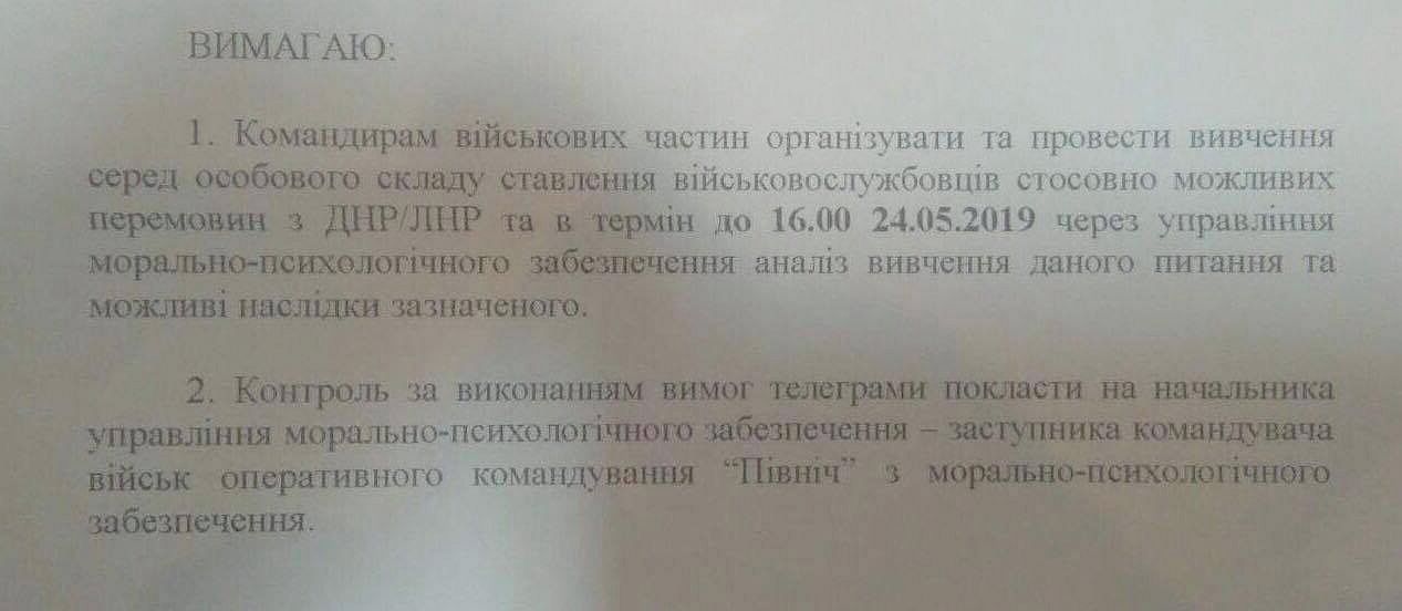 "Командирам воинских частей организовать и провести изучение среди личного состава отношения военнослужащих к возможным переговорам с "ДНР"/"ЛНР" и в срок до 16:00 24.05.2019 через управление морально-психологического обеспечения (доложить – ред) анализ изучения данного вопроса и возможные последствия указанного", – говорится в бумаге без исходящих данных.