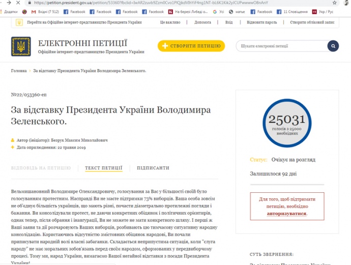 Электронная петиция "За отставку президента Владимира Зеленского" за неполные двое суток набрала 25 тысяч голосов, необходимых для ее рассмотрения главой государства.
