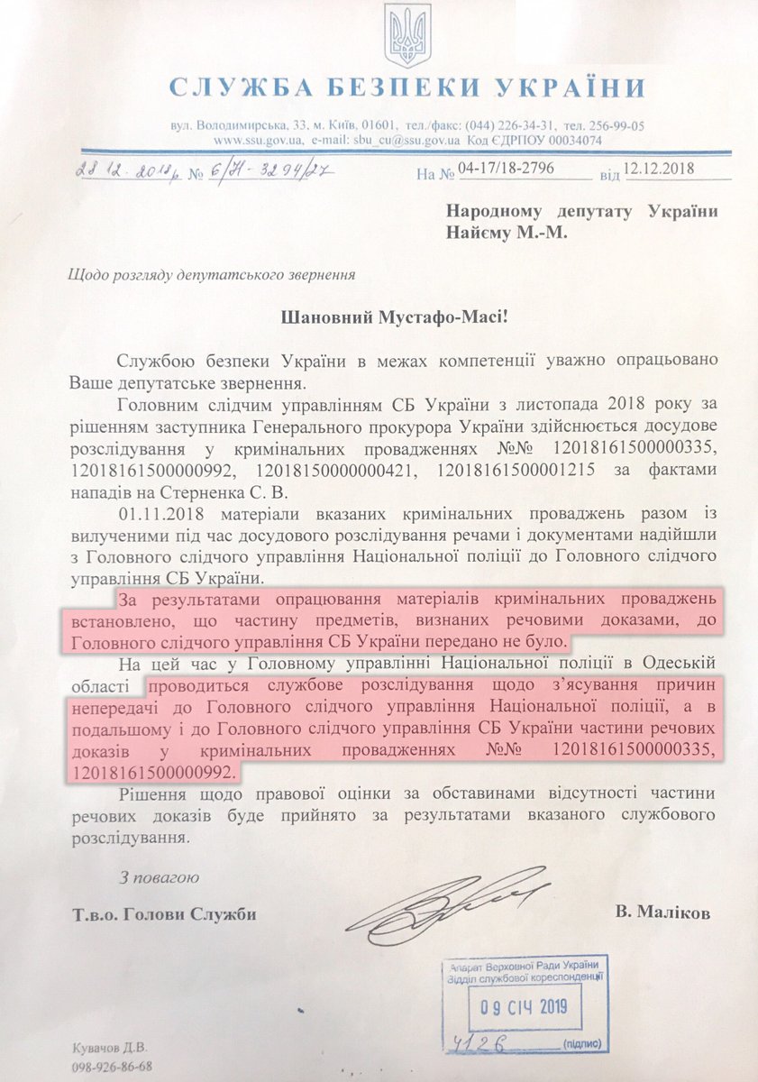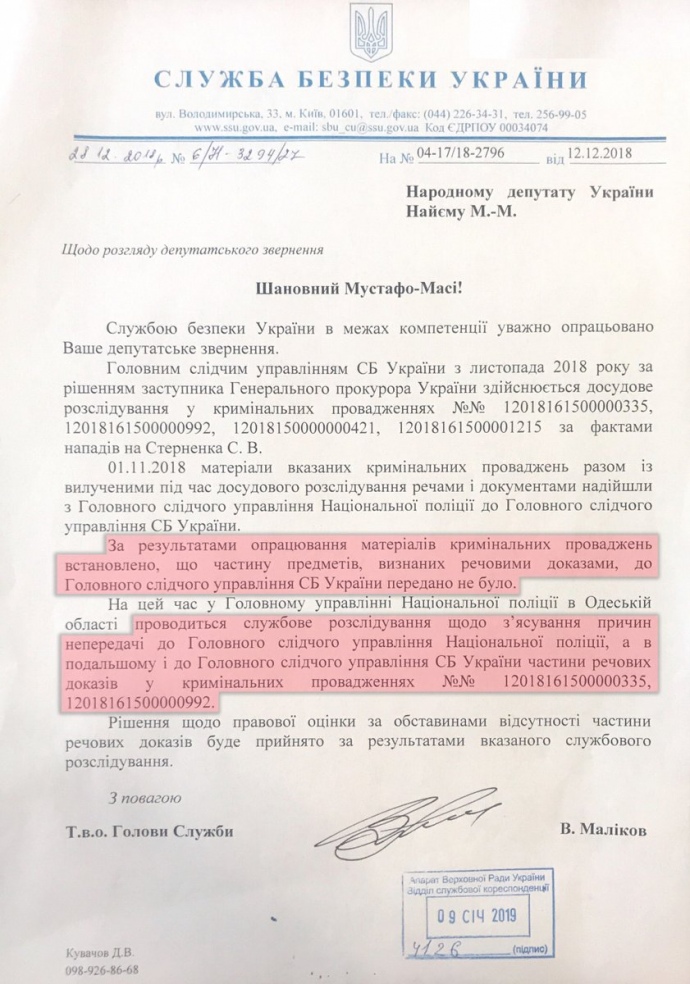 Он показал ответ от СБУ за декабрь 2018 года, в которой указано, что Главное следственное управление СБУ расследует нападения на Стерненко с ноября 2018 года, полиция передала СБУ материалы производств и доказательства 1 ноября