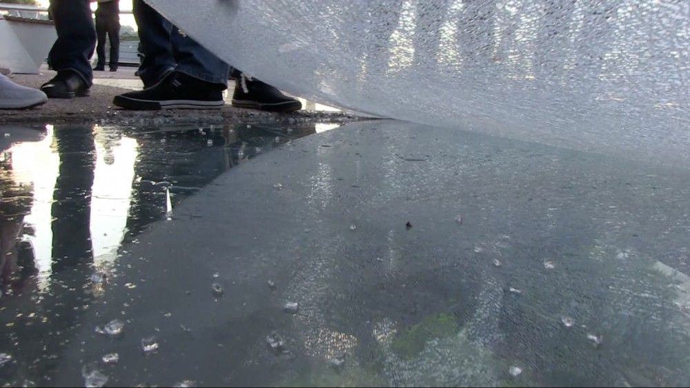 - Уже в воскресенье 26 мая на двух фрагментах пешеходной части треснуло стекло.