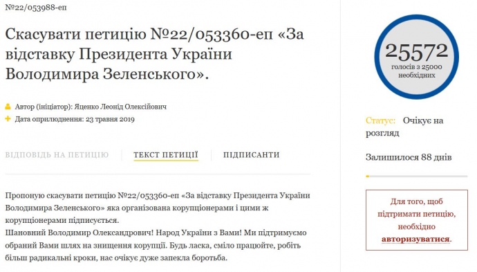 Петиция, предлагающая отменить другую петицию - за отставку президента Владимира Зеленского - тоже собрала необходимые для ее рассмотрения 25 тысяч подписей.