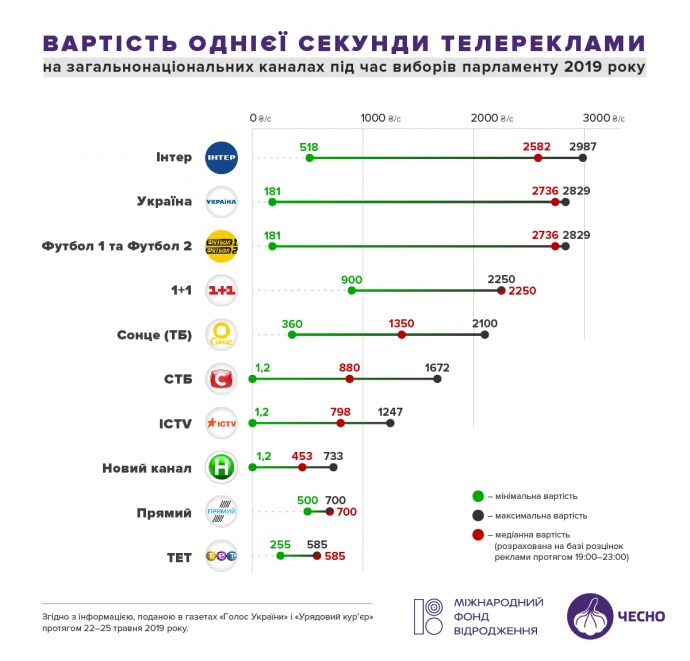 В ЧЕСНО посчитали, что из информационных телеканалов максимальная стоимость секунды рекламы во время парламентской кампании будет на лояльном к экс-президенту Петру Порошенко канале "Прямой" - 700 гривен, а минимальная - 500.
