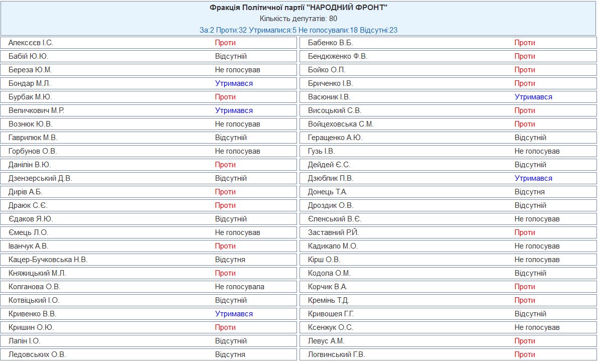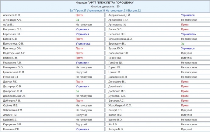 Фракция БПП была почти полностью против отставки главы правительства. Лишь 7 ее членов из 130 поддержали проект постановления, 27 - против, 31 - воздержался, 33 - не голосовали, 32 нардепа отсутствовали.
