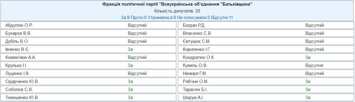 А вот в "Батькивщине" отставку поддержали все 9 присутствующих депутатов, включая Юлию Тимошенко. Остальных 11 членов не было на заседании.