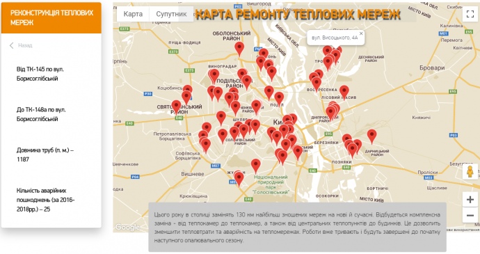 На сайте КП "Киевтеплоэнерго" создали карту ремонта киевских тепловых сетей.