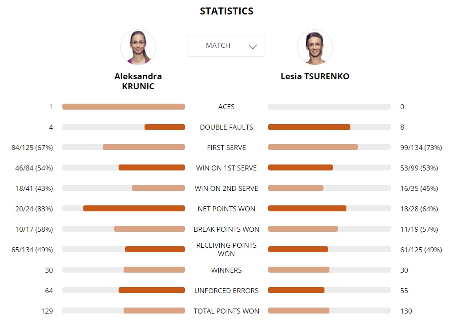 В доигрывании матча против Александры Крунич из Сербии Леся выиграла на два гейма больше, что и принесло ей победу.