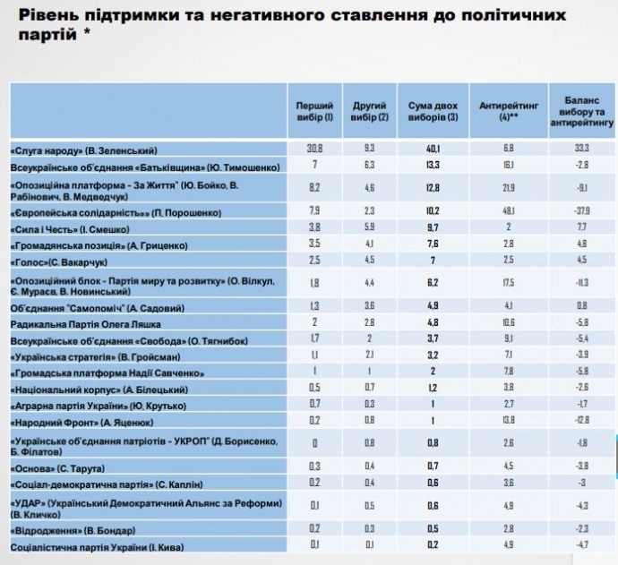 Также сообщается, что в тройке антирейтинга находятся политсила "Оппозиционный блок - За жизнь", которую не поддерживают 21,9% респондентов, и ВО "Батькивщина" - 16,1%.