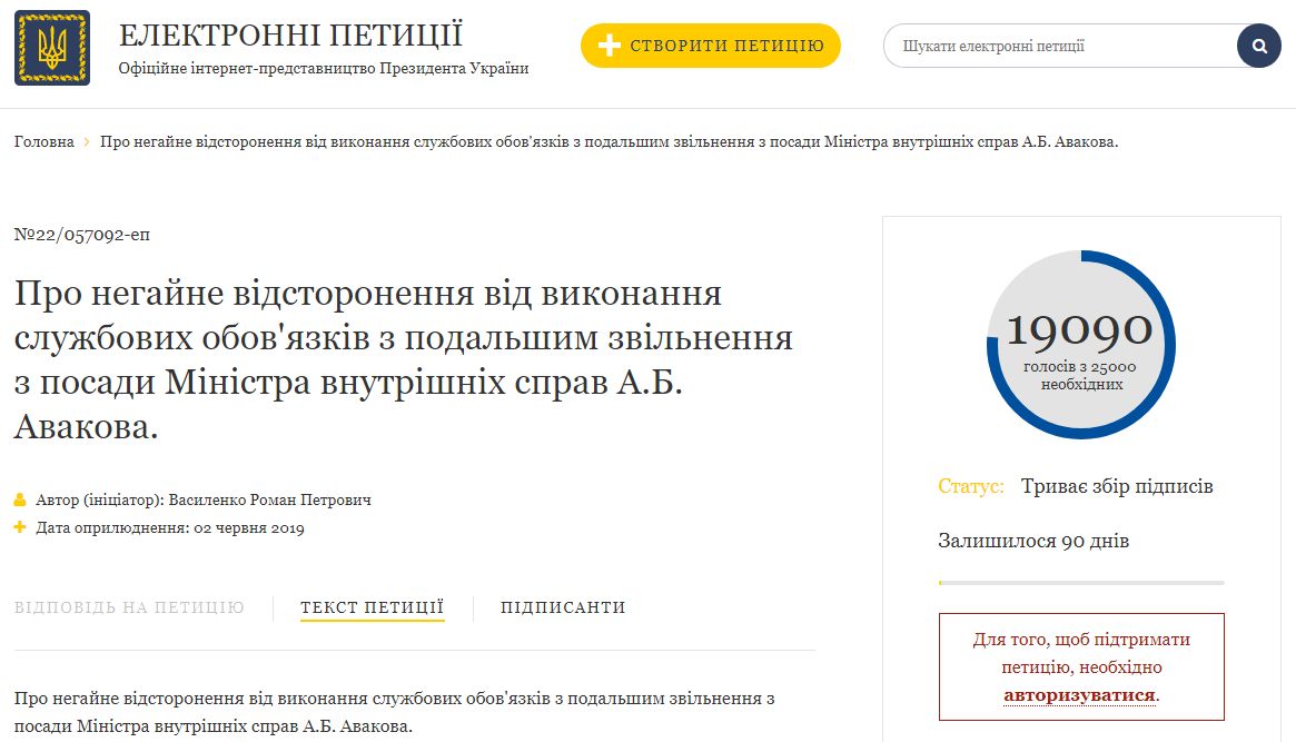 Петиция об отстранении и увольнении министра внутренних дел Арсена Авакова набрала уже 19 тысяч голосов из необходимых 25 тысяч.