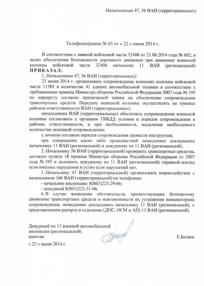 В частности, это - телефонограмма от 22 июня 2014 года, в которой говорится о приказе начальникам курской и воронежской военных автомобильных инспекций организовать 23 июня сопровождение военной техники по дорогам общего пользования.