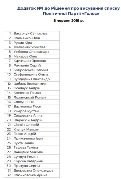 Возглавил список сам Вакарчук, второй номер - Юлия Клименко (экс-заместитель министра экономического развития и торговли Украины), третий - Кира Рудык (глава IT-компании Ring Ukraine).