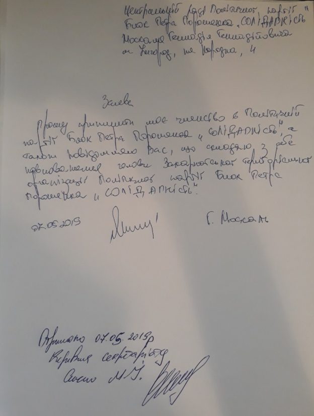 "Прошу прекратить мое членство в политической партии Блок Петра Порошенко "Солидарность". Также сообщаю, что слагаю с себя полномочия председателя Закарпатской территориальной организации политической партии Блок Петра Порошенко "Солидарность", - говорится в заявлении.