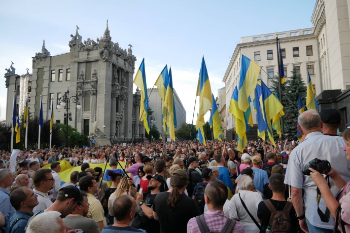 Как сообщает корреспондент УП, несколько тысяч человек, среди которых ветераны, волонтеры, блогеры вышли с плакатами "Нет капитуляции".