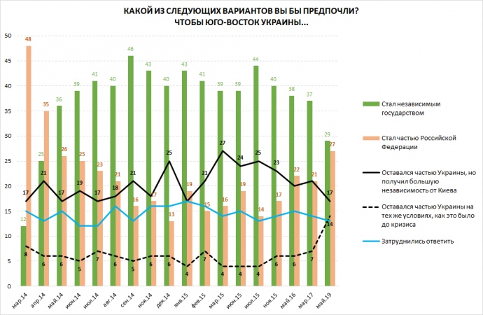 В то же время, с мая 2014 года в опросе лидирует позиция, что регион должен стать "независимым государством". В мае 2019 года такой точки зрения придерживались 29% респондентов, 5 лет назад – 36%.