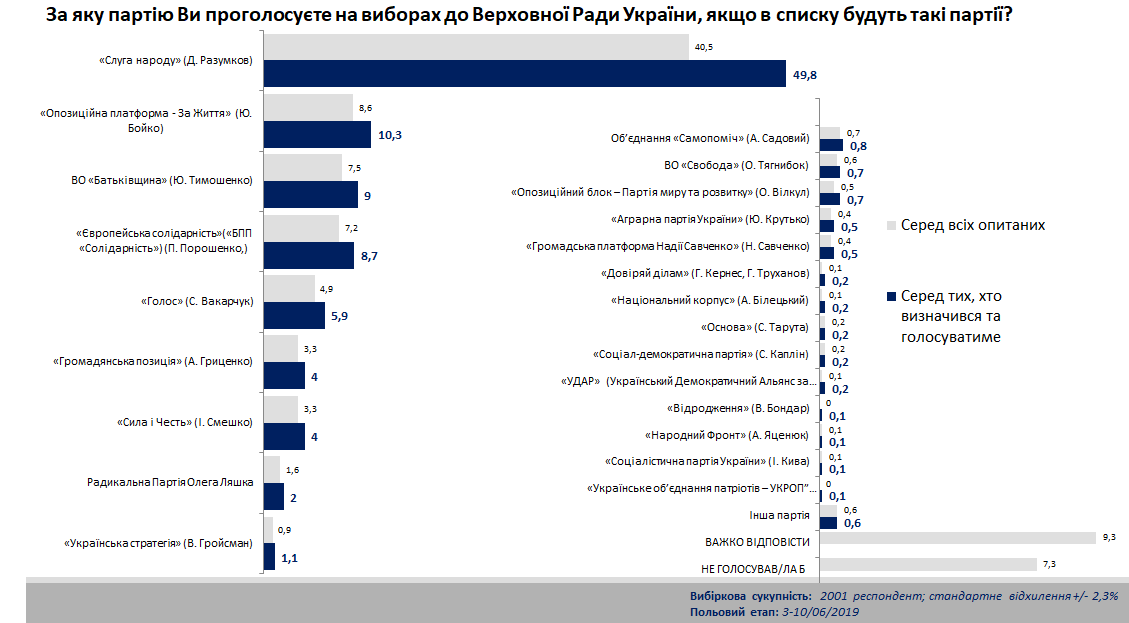 Согласно исследованию, проходной барьер также преодолевают "Оппозиционная платформа - За жизнь" (10,3%), "Батькивщина" (9,0%), "Европейская Солидарность" (8,7%), партия "Голос" ( 5,9%).