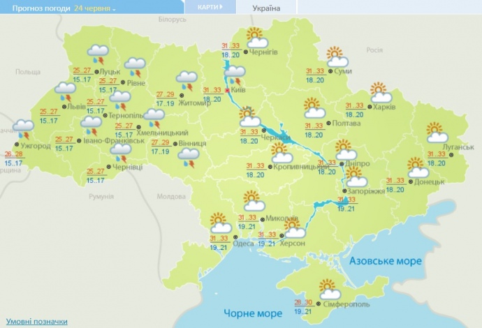 25 июня осадков в Украине не ожидается, температура 25-30°, в северных областях 26-31°.