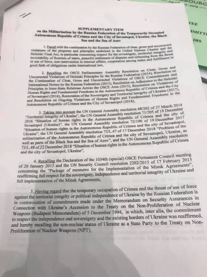 Комитет по политическим вопросам и безопасности Парламентской ассамблеи ОБСЕ принял резолюцию "Милитаризация Российской Федерацией временно оккупированной Автономной Республики Крым, Севастополя, Черного и Азовского морей".