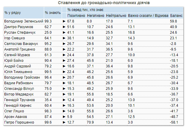 Наиболее положительно среди политиков и общественных деятелей украинцы относятся к действующему президенту Владимиру Зеленскому, наиболее негативно - к его предшественнику Петру Порошенко.