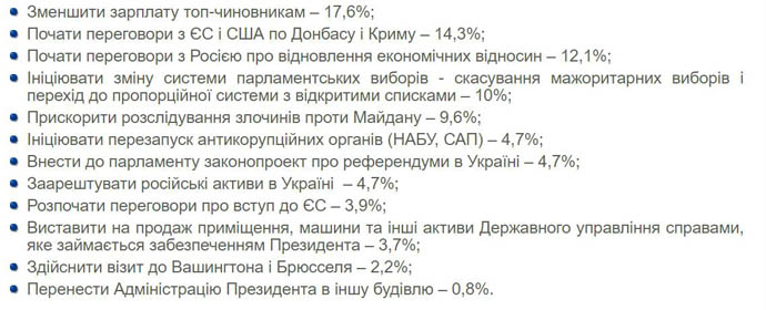 Опрошенным предлагали дать три варианта ответов, из предложенных социологами, на вопрос "Что вы хотели бы, чтобы новый президент Владимир Зеленский сделал в свои первые 100 дней?".